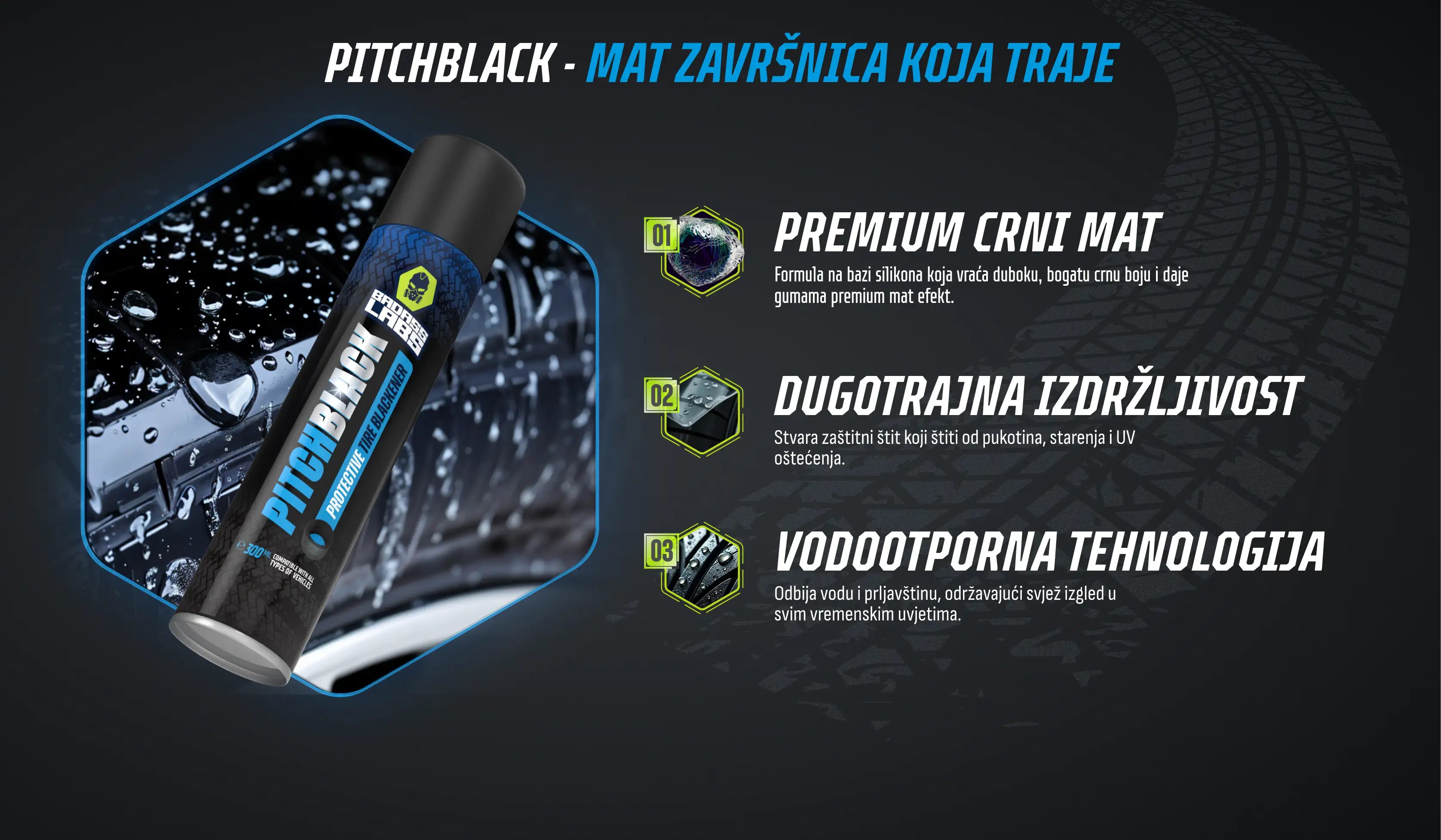 PitchBlack е иновативен спрей на силиконова основа, предназначен за обновяване и защита на гумите. Той създава хидрофобно защитно покритие върху повърхността и същевременно прониква в гумата, като я омекотява и ѝ придава наситено черен, матов цвят. PitchBlack значително ще подобри цялостния външен вид на гумите и те ще бъдат защитени от атмосферните влияния, като ще бъдат и по-устойчиви на надраскване.
