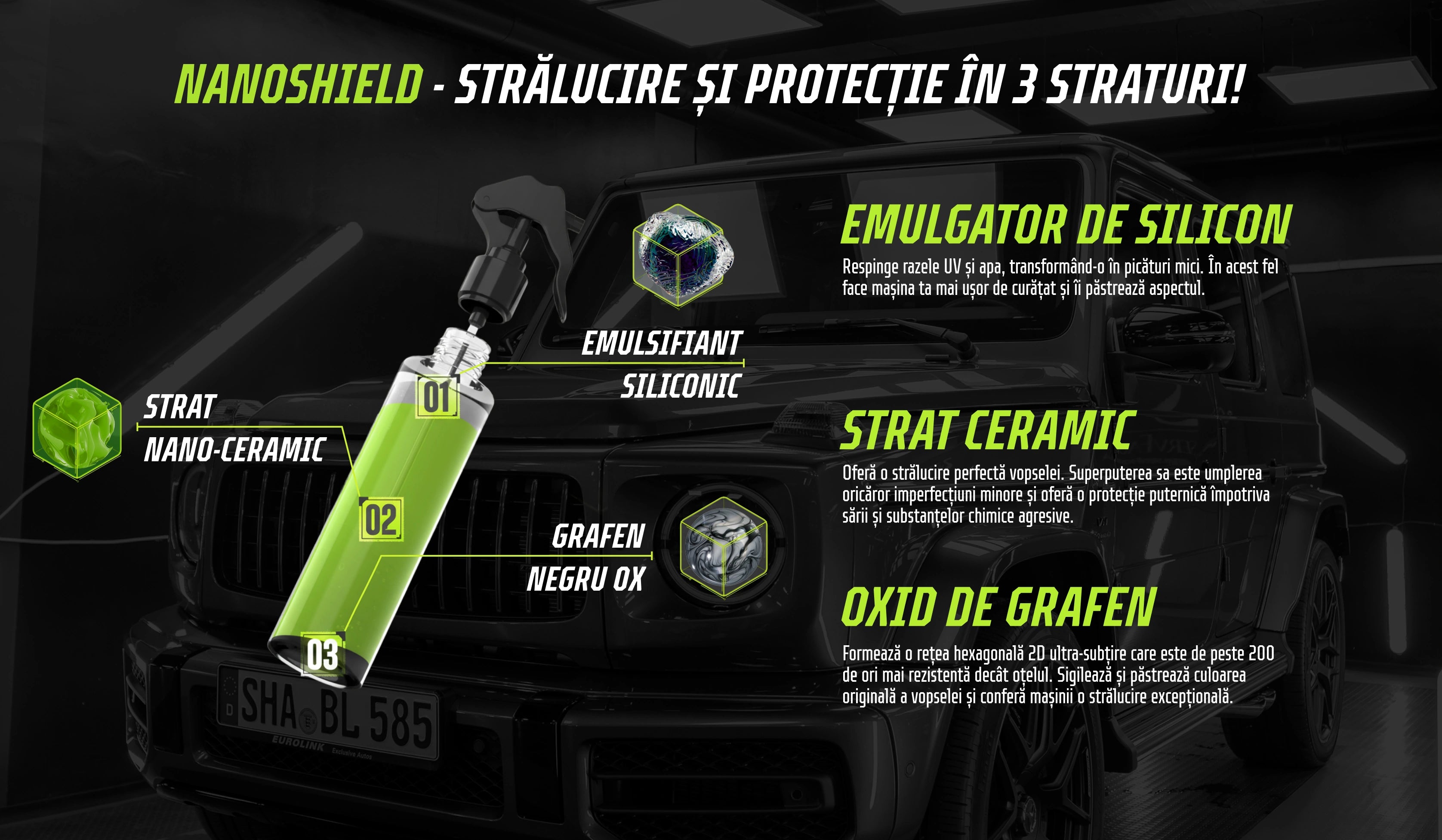Nanoshield este o revoluție în cosmetica auto. Cu el mașina ta nu doar că va arăta impecabil, dar formula sa inovatoare cu trei componente din grafen, acoperire nano-ceramică și silicon va proteja vopseaua automobilului de numeroși factori (vezi lista completă mai jos). O sticlă Nanoshield este suficientă pentru acoperirea de două ori a unui automobil de mărime medie.